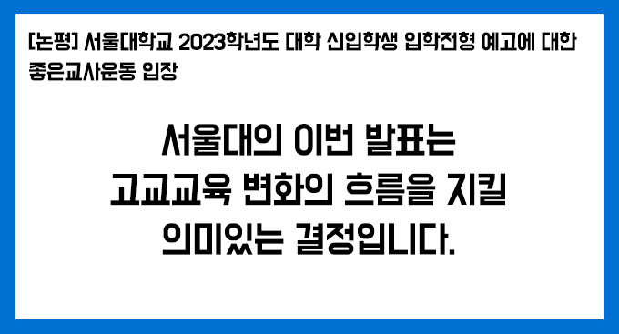 고교교육에 끼치는 긍정적 영향을 확산하려면 서울대학교 입학전형 하나의 변화에 그쳐서는 안 됩니다. 고교교육의 정상화와 교육의 공공성 확립을 위해 다른 대학에서도 입학 전형의 변화에 적극 나서 주시기를 촉구합니다.