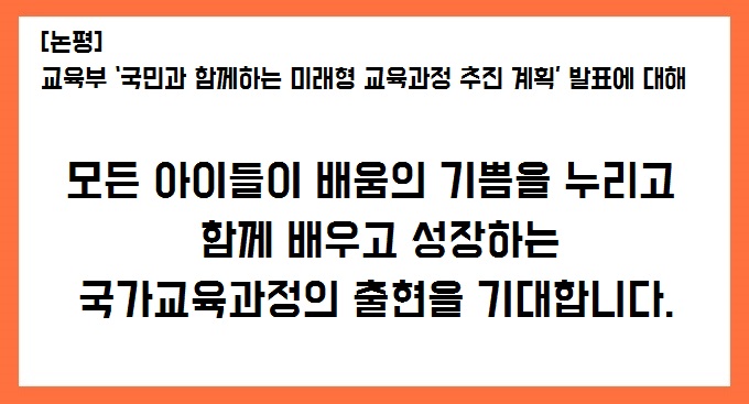 포용교육, 미래교육 등의 목표는 환영할만하지만 새로운 교육과정의 목표가 선언적 구호에 그쳐서는 안 됩니다. 새로운 교육과정의 현장 이행을 실질적으로 지원하는 체제가 무엇인지에 대한 논의까지 함께 이루어져야 합니다. 7차 교육과정, 2015개정교육과정 모두 미래 지향적 교육의 가치를 표방했지만, 현장에서 제대로 실현되기 어려웠음을 우리는 너무 잘 알고 있습니다. 새로운 교육과정을 담을 현장의 지원 시스템이 부재했기 때문입니다. 대입제도와 교장 승진제도의 개혁, 교사별 평가나 교과서 자유발행제, 범교과 의무수업의 교육과정 흡수 등 새로운 교육과정을 실행할 수 있는 실질적인 지원체제가 무엇인지 함께 논의되고 이행되어야 할 것입니다.